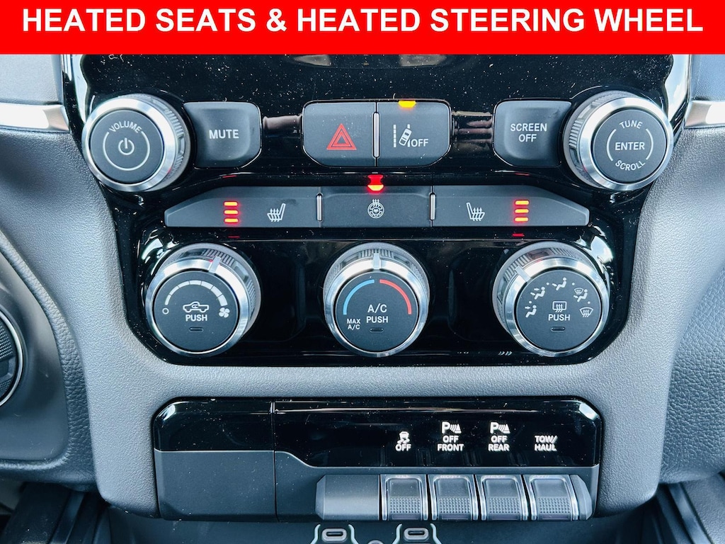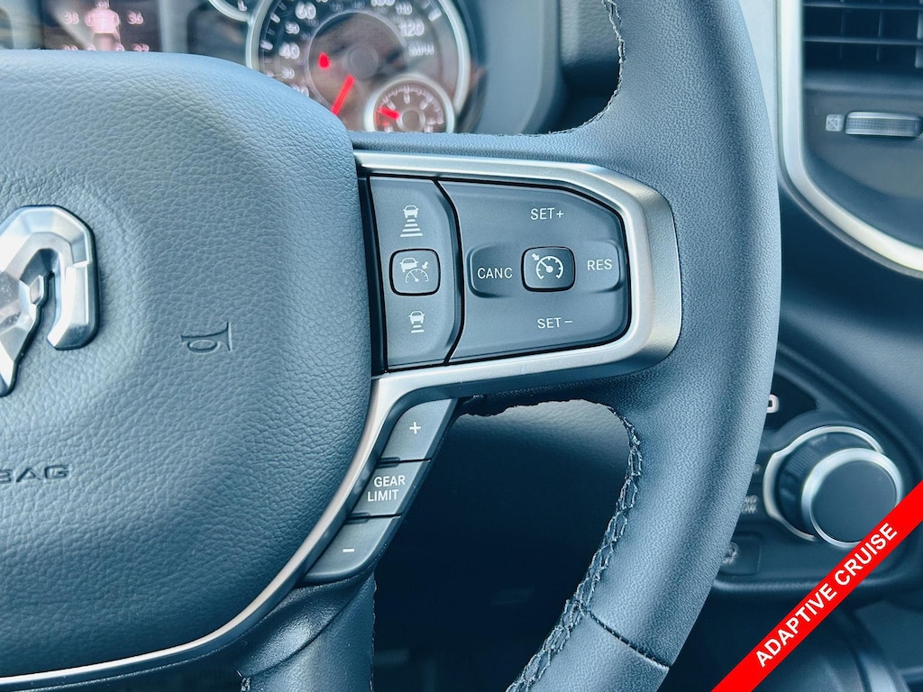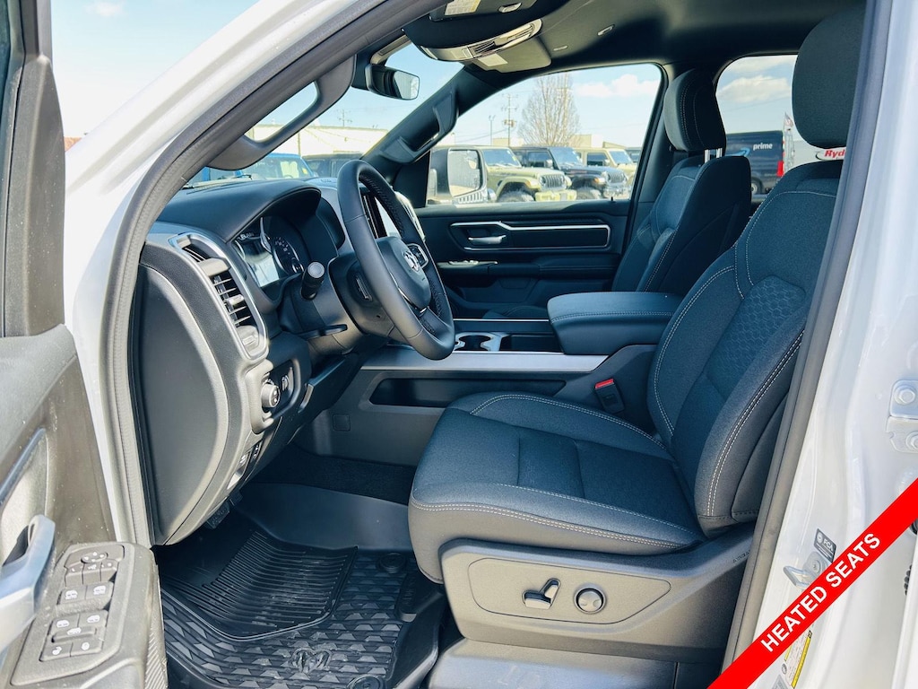 Step inside the Black interior of this RAM 1500 Big Horn and experience a comfortable and refined cabin. The Premium cloth front seat upholstery provides a comfortable seating surface for long drives. Find your perfect driving position with the Power Adjust 8-Way Driver Seat and Power 2-Way Driver Lumbar Adjust. The Heated front seats Heated driver and front passenger seats and Heated steering wheel will keep you warm on chilly mornings. Keep everyone comfortable with the Manual climate control and Rear console climate control ducts. The Steering wheel material Leather steering wheel adds a touch of luxury. The Keyfob remote start allows you to warm up the truck before you even step outside. The Adjustable pedals Power adjustable pedals will help you find the most comfortable driving position.