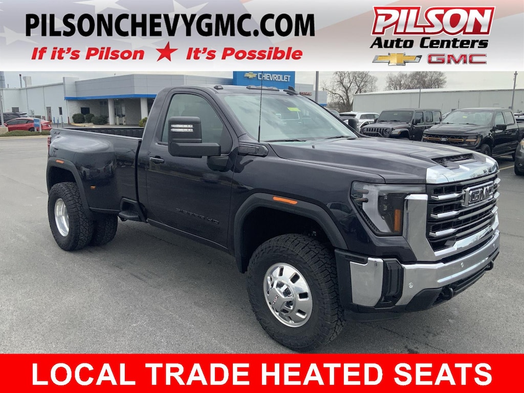 PICKUP BED, DUAL REAR WHEELS, EMISSIONS, FEDERAL REQUIREMENTS, ENGINE, 6.6L V8 WITH DIRECT INJECTION AND VARIABLE VALVE TIMING, GASOLINE, TRANSMISSION, 10-SPEED AUTOMATIC, GVWR, 14,000 LBS. (6350 KG) WITH DUAL REAR WHEELS, REAR AXLE, 3.73 RATIO, WHEELS, 18" (45.7 CM) POLISHED FORGED ALUMINUM, TIRES, LT235/80R18 ALL-TERRAIN, BLACKWALL, TIRE, SPARE LT235/80R18 BLACKWALL ALL-TERRAIN, TITANIUM RUSH METALLIC, SEATS, FRONT 40/20/40 SPLIT-BENCH, JET BLACK, CLOTH SEAT TRIM, AUDIO SYSTEM, 13.4" DIAGONAL PREMIUM GMC INFOTAINMENT SYSTEM, PREFERRED PACKAGE, SLE CONVENIENCE PACKAGE, SIERRA HD PRO SAFETY PLUS PACKAGE, REMOTE START PACKAGE, SLE HEATED PACKAGE, ENGINE BLOCK HEATER, TRANSFER CASE, TWO-SPEED ACTIVE, BATTERY, AUXILIARY, 700 COLD-CRANKING AMPS/70 AMP-HR, ALTERNATORS, DUAL, 220-AMPS PRIMARY, 170-AMPS AUXILIARY, TRAILERING WIRING PROVISIONS, SKID PLATES, HEAVY DUTY FRONT SPRING/CAMPER PACKAGE, WHEEL TRIM, CHROME TRIM SKINS AND CHROME CENTER CAPS, LPO, REAR WHEELHOUSE LINERS, BEDLINER, SPRAY-ON, FOG LAMPS, LED, LED CARGO AREA LIGHTING, LAMPS, SMOKED AMBER ROOF MARKER, (LED), MIRRORS, OUTSIDE POWER-ADJUSTABLE VERTICAL TRAILERING WITH HEATED AND AUTO-DIMMING UPPER GLASS, LPO, BLACK BADGING PACKAGE, LPO, BLACK GMC EMBLEMS, LPO, BLACK SIERRA NAMEPLATES, TAILGATE, GMC MULTIPRO TAILGATE, SEAT ADJUSTER, DRIVER 10-WAY POWER INCLUDING LUMBAR, SEATING, HEATED DRIVER AND FRONT OUTBOARD PASSENGER, STEERING WHEEL, HEATED, STEERING COLUMN, MANUAL TILT-WHEEL AND TELESCOPING, UNIVERSAL VEHICLE MODULE, IN-VEHICLE TRAILERING APP, REMOTE VEHICLE STARTER SYSTEM, ADAPTIVE CRUISE CONTROL, THEFT-DETERRENT SYSTEM, UNAUTHORIZED ENTRY, UPFITTER SWITCH KIT, (5), AIR CONDITIONING, DUAL-ZONE AUTOMATIC CLIMATE CONTROL, DEFOGGER, REAR-WINDOW ELECTRIC, MIRROR, INSIDE REARVIEW AUTO-DIMMING, FRONT AND REAR PARK ASSIST, ULTRASONIC, HITCH GUIDANCE WITH HITCH VIEW, REAR CROSS TRAFFIC ALERT, TRAILER SIDE BLIND ZONE ALERT