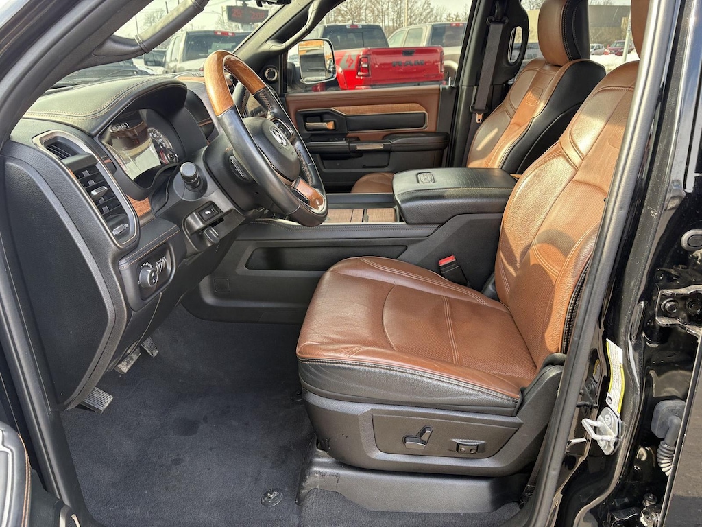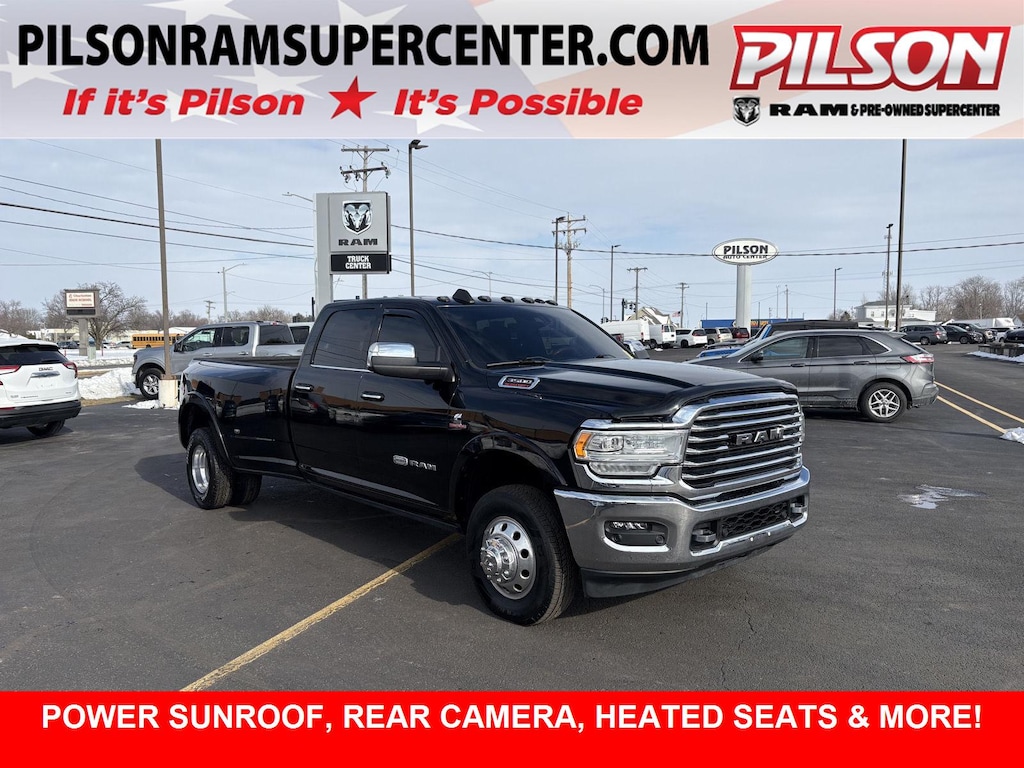 ENGINE: 6.7L I6 CUMMINS HO TURBO DIESEL, TRANSMISSION: 6-SPEED AUTOMATIC AISIN AS69RC HD, QUICK ORDER PACKAGE 21K LONGHORN, 4.10 AXLE RATIO, WHEELS: 17 X 6.0 PREMIUM ALUMINUM, TIRES: LT235/80R17E BSW AS, MONOTONE PAINT, DIAMOND BLACK CRYSTAL PEARLCOAT, CATTLE TAN/BLACK, PREMIUM LEATHER BUCKET SEATS, GVWR: 14,000 LBS, LONGHORN LEVEL 1 EQUIPMENT GROUP, DUAL REAR WHEELS, TOWING TECHNOLOGY GROUP, SAFETY GROUP, PROTECTION GROUP, 220 AMP ALTERNATOR, 5TH WHEEL/GOOSENECK TOWING PREP GROUP, TRAILER TIRE PRESSURE MONITORING SYSTEM, CHROME TOW HOOKS, AUTO LEVEL REAR AIR SUSPENSION, ADAPTIVE STEERING SYSTEM, 50 GALLON FUEL TANK, POWER SUNROOF, MOPAR DEPLOYABLE BED STEP, CLEARANCE LAMPS, RADIO: UCONNECT 12.0 W/NAVIGATION, BLIND SPOT & CROSS PATH DETECTION, I/P MOUNTED AUXILIARY SWITCHES, CTR STOP LAMP W/CARGO VIEW CAMERA